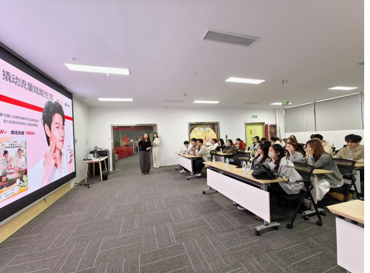 随后进行的交流宣讲会将活动推向了高潮。让同学们倍感亲切与振奋的是,本次宣讲会的主持人正是2017届播音与主持艺术专业的毕业生闫艺。她以校友和百万粉丝主播的双重身份,生动地分享了自己从校园走向行业的心路历程,并围绕“播音学子在直播电商中的职业优势”这一主题,进行了深入浅出的讲解。她指出:“我们专业的核心能力——清晰的口语表达、敏捷的思维反应以及强大的情绪共情力,在直播赛道上都是不可替代的核心素质。” 在互动环节,同学们积极踊跃,就专业学习与职业选择与闫艺进行了热烈交流。