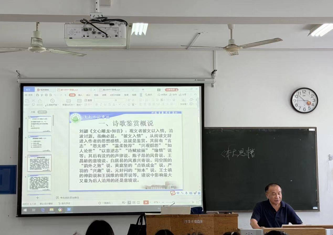 本网讯(通讯员:唐洁)为深化学生对中国古典诗歌的理解,领略唐诗的艺术魅力,文化与传媒学院于5月21日下午3:00在教5 - 215举办了一场主题为“唐诗是中国古典诗歌的巅峰,其艺术魅力源于意象与意境的精妙融合”的精彩讲座。本次讲座由朱玉教授担任主讲人,众多热爱古典文学的师生参与其中。