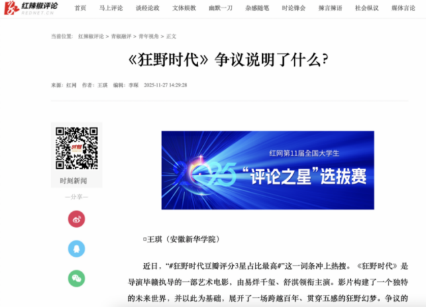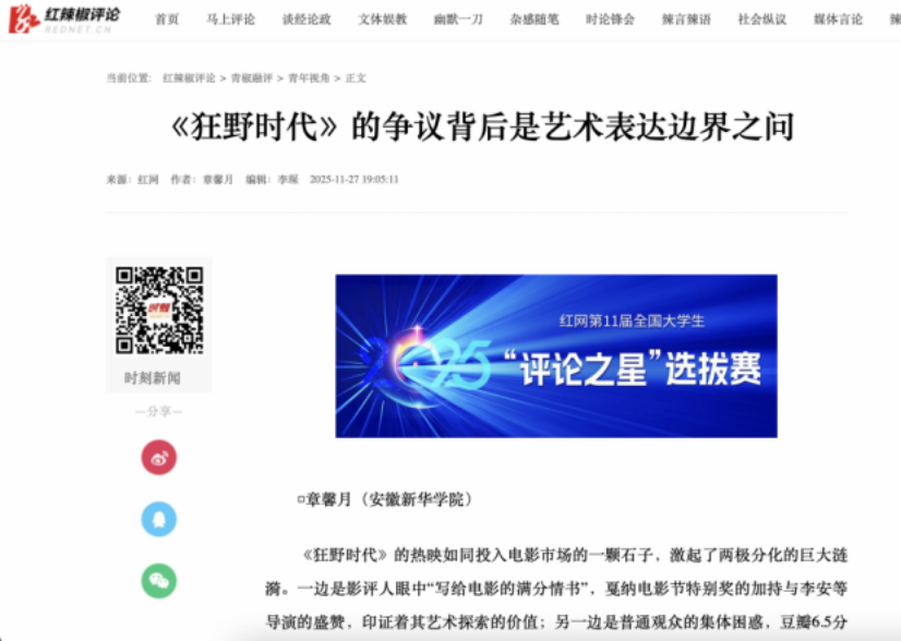 理念的创新为教学发展注入绵绵动力。课程以“以赛促学、以赛促练”为抓手,组织学生积极参与全国性新闻评论赛事。在与全国高校学子的激烈角逐中,23级新闻学专业王琪、章馨月两名学生的新闻评论作品凭借扎实的论证功底与敏锐的社会观察,从众多投稿稿件中脱颖而出,成功刊载于红网 “红辣椒评论” 频道,展现了学院新闻专业学生的过硬实力。