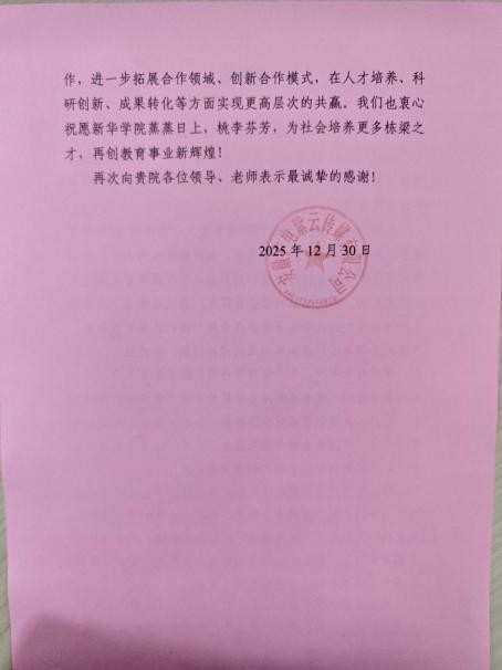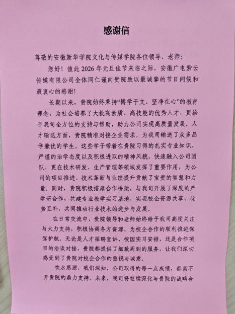 作为对当前合作成果的肯定与对未来共赢的期待,安徽广电紫云传媒有限公司代表于座谈现场向我院郑重致送感谢信。双方借此契机,当场达成共识,决定将合作全面升级至战略层面,共同聚焦于数字文旅与AIGC领域的创新研发与人才共育。