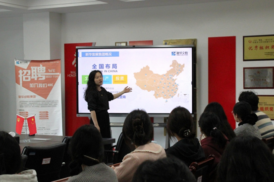 宣讲会伊始,金星辰向学子致以欢迎,详细介绍了两家企业的发展定位与核心优势。新华幼教集团深耕学前教育,秉持“以爱育人、科学启蒙”理念,旗下拥有多家优质园区,师资培养体系完善;东方慧升教育聚焦多元化教育服务,涵盖课程研发、管理咨询等板块,致力于提供优质教育解决方案。