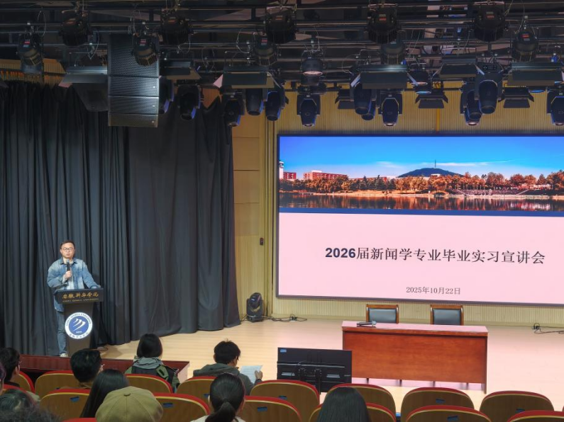 本网讯(通讯员:闵纯子;汪恒宇)为进一步搭建实习就业桥梁,帮助2026届新闻学专业毕业生明确职业方向、精准对接职场资源,10月22日上午9点,文化与传媒学院在教八文传演播厅举办新闻专业“皖美赋能”毕业实习宣讲会。此次活动邀请新安晚报资深媒体人刘高威、合肥夜校策划总监张秋韵、安徽生活网人力资源负责人刘婷婷及2025届毕业生王艺分享交流,院长助理翟春翔、新闻专业负责人杨小璇、新闻专业教师汪恒宇出席。