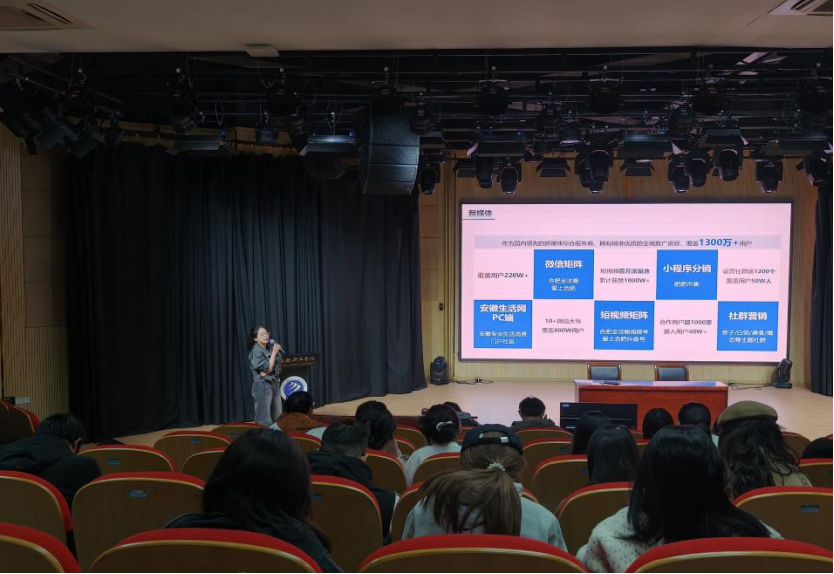 在企业宣讲环节中,安徽生活网与合肥夜校分别介绍其企业概况与实习生招募计划。