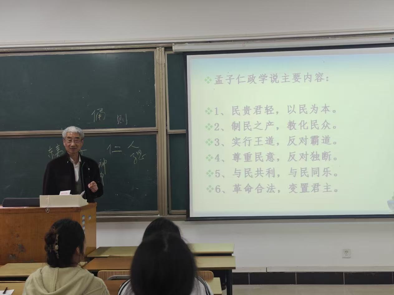 在核心内容阐释环节,胡教授以生动案例解析儒家思想的关键演进。他重点分析了周公“以德配天”的宗教改革,认为这是中国政治思想从神本走向人本的重要转折。通过对《尚书》《孟子》等经典的解读,胡教授阐释了孔子“为政以德”的治理理念如何发展为孟子系统的仁政学说,其中“民贵君轻”的民本思想、“制民之产”的经济主张、“与民同乐”的政治理想,共同构成了儒家政治哲学的完整体系。值得一提的是,胡教授还通过对比分析法家思想,凸显儒家德治主张的独特性,使在场师生对先秦思想格局有了更立体的认识。