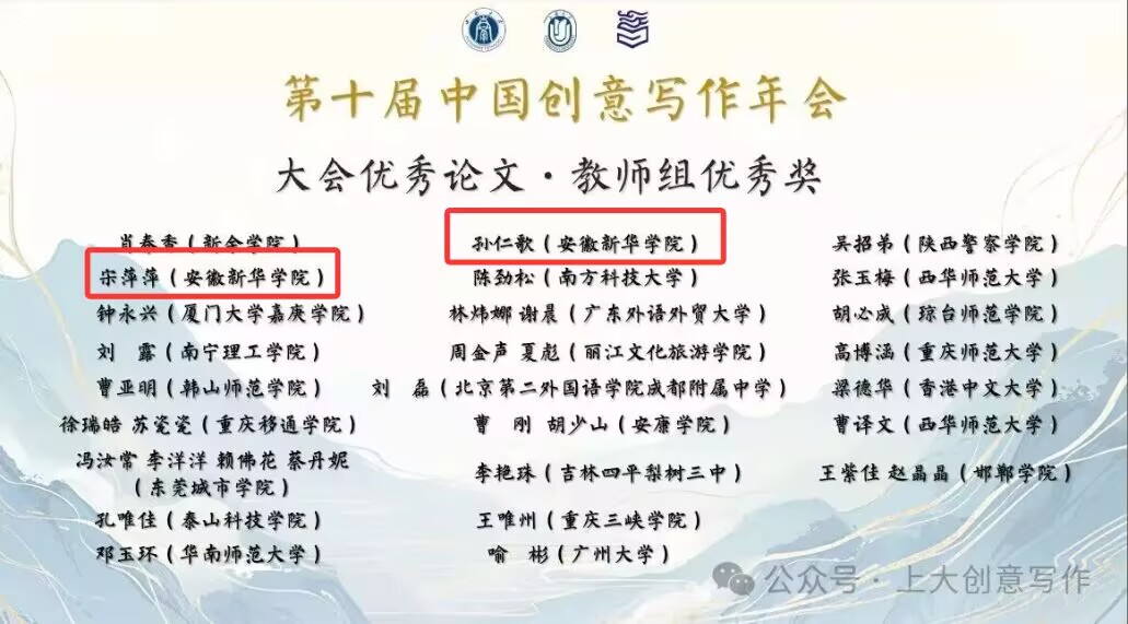 孙仁歌教授、宋萍萍老师的论文荣获大会教师组优秀论文奖。本届大会优秀会议论文评审小组由主办方西南大学、上海大学、高等教育出版社,及《中国创意写作研究》编辑部连同第三方学术顾问共同组成,我院两篇获奖论文深受大会评委组好评。