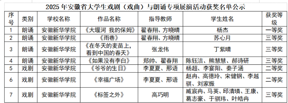 本网讯(通讯员:李夏夏)近日,由安徽省教育厅主办的2025年安徽省大学生戏剧(戏曲)与朗诵专项展演活动评选结果正式公布。安徽新华学院学子在本届展演中表现突出,共荣获一等奖1项、二等奖2项、三等奖4项。
