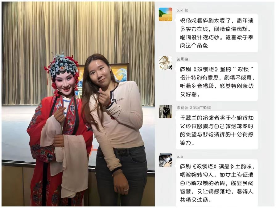 本网讯(通讯员:潘驰群)近日,一堂生动的《安徽地方戏曲》实训课从新华园延伸至合肥大剧院。学生们通过观摩青春版庐剧《双锁柜》,感受剧本文学、戏曲唱腔等理论在舞台上的立体呈现,深化了对地方戏曲艺术特征的沉浸式理解。
