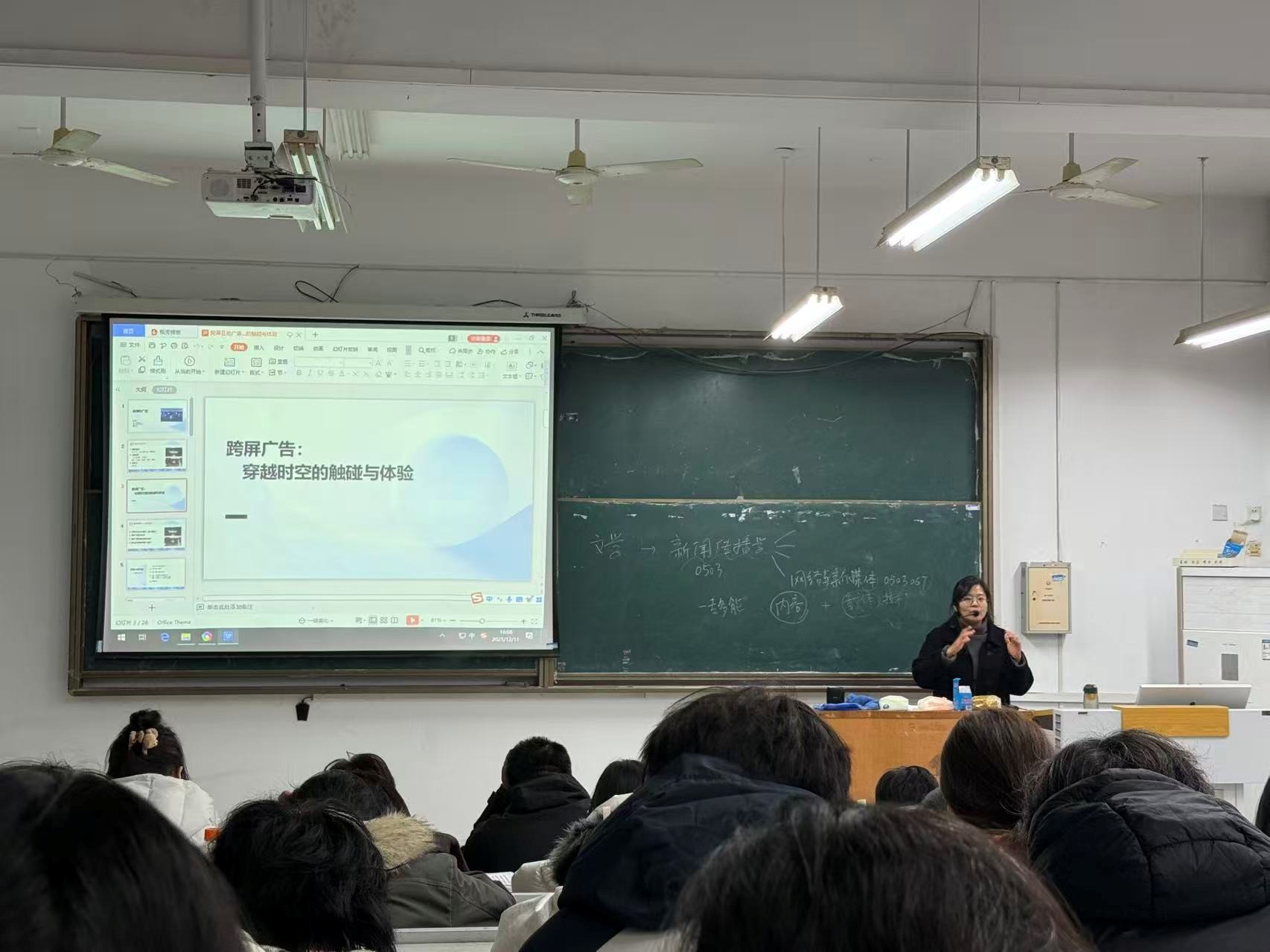 本网讯(通讯员:李理 俞扬稣)2025年12月,文化与传媒学院在教二211教室成功举办题为“跨越时空的互动广告”的讲座。本次讲座由新闻系负责人李理副教授主讲,聚焦于跨屏广告这一前沿领域,吸引了网络与新媒体专业的百余名师生到场聆听。