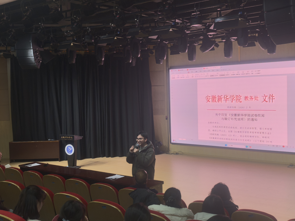 随后,会议进入系级工作汇报环节。刘翔老师首先就期末试卷批改规范与要求进行了详细说明。他结合学校相关规定和中文系实际,对阅卷流程、评分标准、材料归档等环节提出了明确要求,并感谢各位老师在期末繁忙工作中给予的支持与配合。