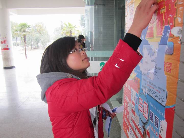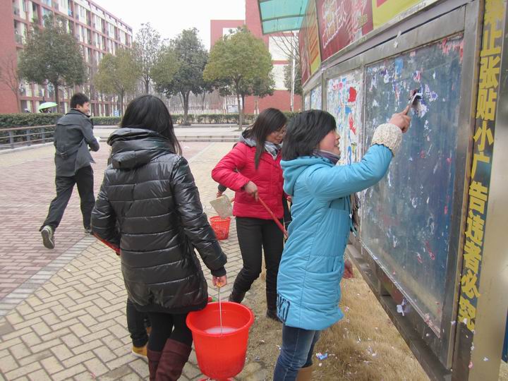 教学楼外的宣传栏是清扫的重点,牢牢黏住的广告纸让同学们的工作很不轻松,这种成堆的小广告会影响到学院的形象,也会应为广告挡住宣传栏给同学们造成不便,“我们每天在这里上课,肩上自然多了一份责任,每个人都有义务维护学院的形象,保持一个良好的学习环境。”负责清理宣传栏同学们纷纷表示。