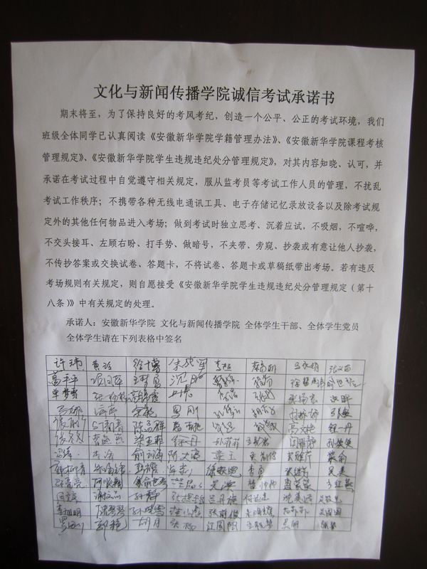 会上,全体学生宣誓承诺,严格遵守考风考纪,绝不作弊,认真复习,同时,每名学生亲自签署了文化与新闻传播学院诚信考试承诺书。之后,贺行佳作出要求,他提出:一、文化与新闻传播学院连续六年未发生一例考试作弊现象,同学们要继续保持优良的考试作风;二、各班级召开主题班会,承诺将覆盖到全院每一位同学,“承诺是形式,要服务于实施,根本在践行”;三、同学们会后收集全国优秀共产党员资料,创造良好的学习优秀典范的氛围,奖学习落实到现实生活,积极向党组织靠拢。