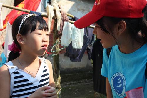 由于斗山河村的住户相对分散,所以志愿者们想要宣传到位就显得格外困难,再加上炎热的天气条件,更是困难,但这并没有减轻志愿者的热情,7月10日一早,志愿者们便早早的准备完毕,在文化与新闻传播学院行政副院长贺行佳的妹妹的带领下,前往斗山河村家家户户开展宣传工作。整个一上午的工作开展十分顺利,基本上志愿者们表明身份和目的后,都会得到大力支持,而且有些友好的乡亲还会给大家提供水、冰棍等解暑食物,给志愿者们带去了感动和更大的信心。
